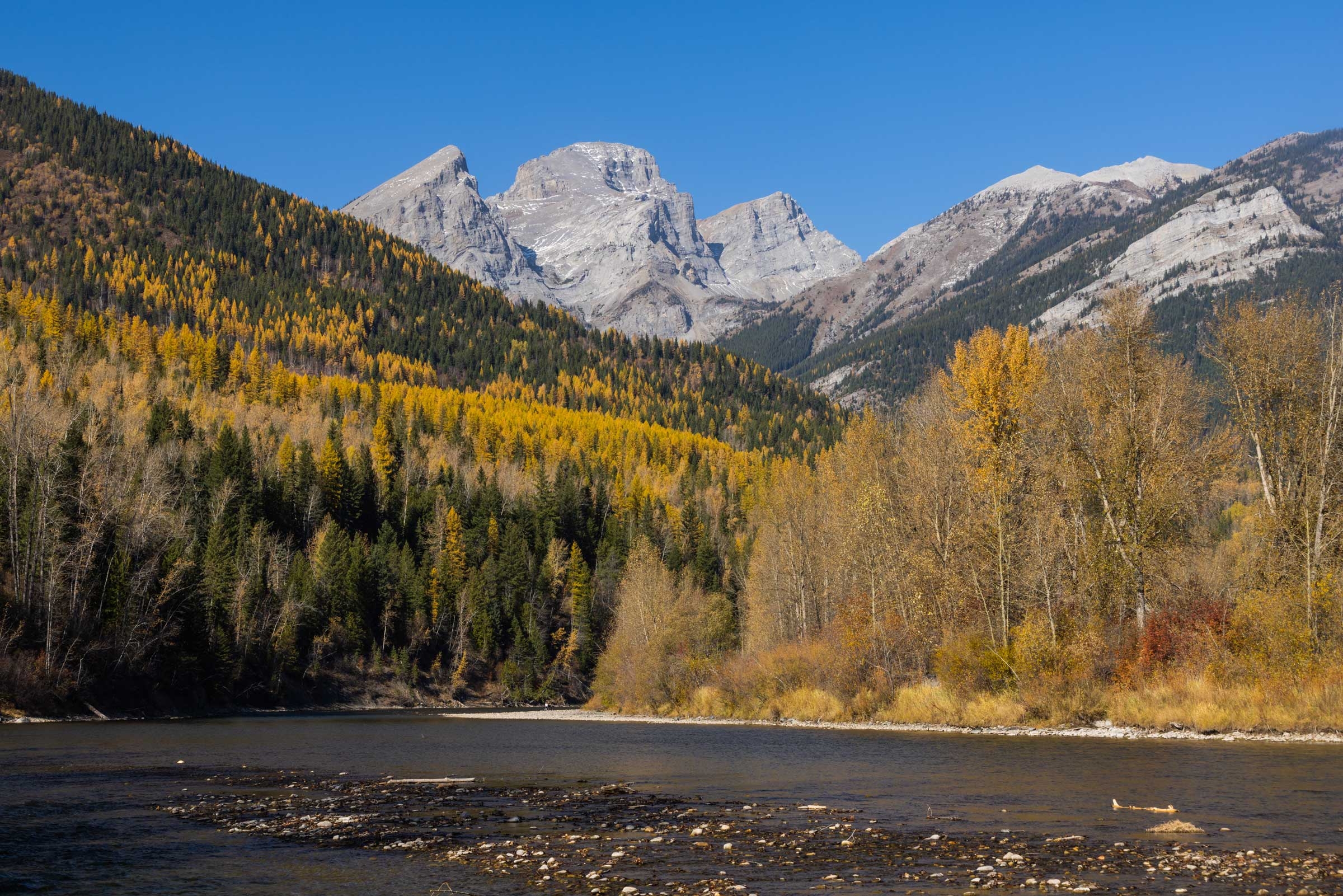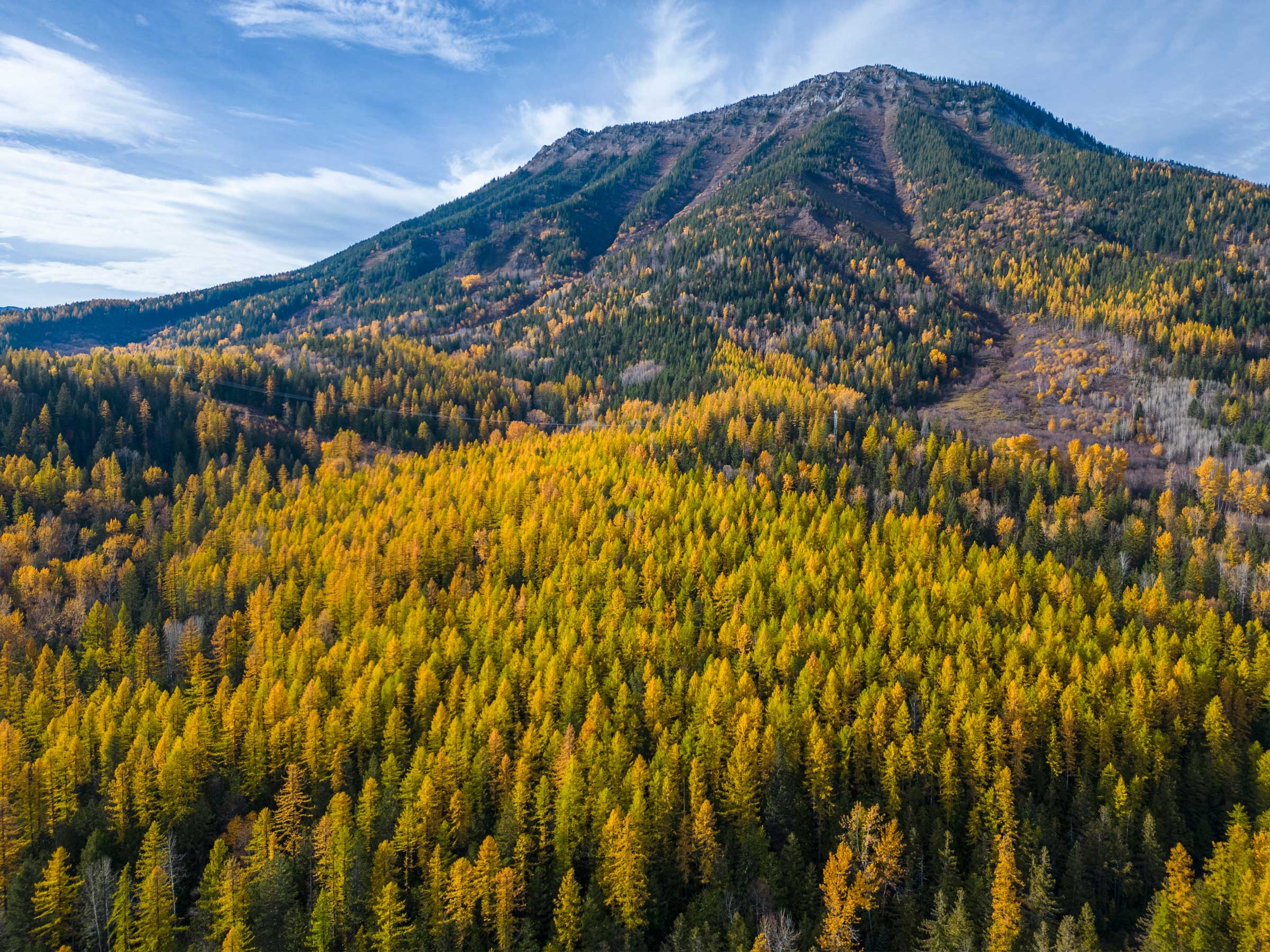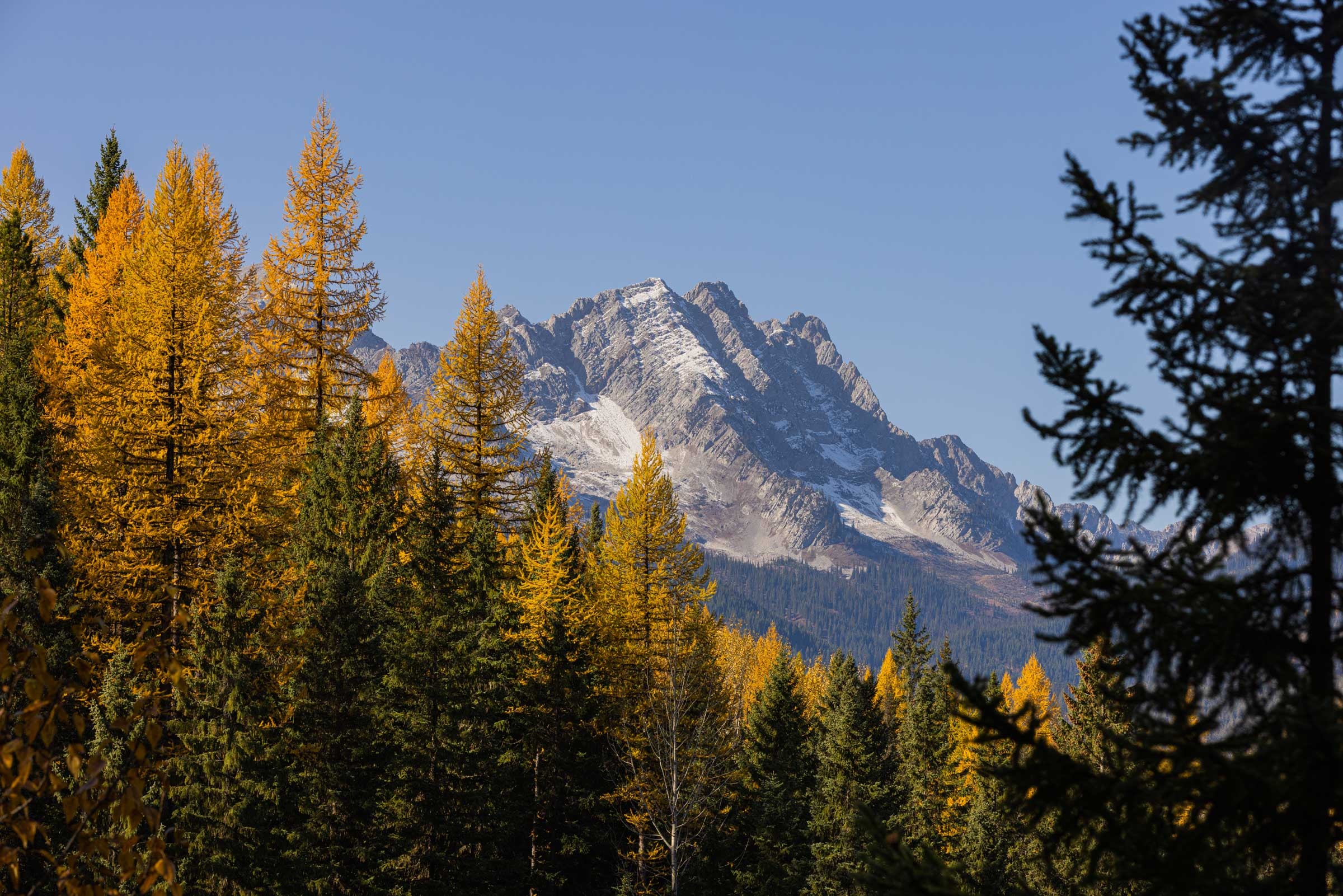 Larches take center stage on the slopes of Mt. Fernie, their vibrant golden hues creating a stunning contrast against the backdrop of majestic peaks and deep blue skies.