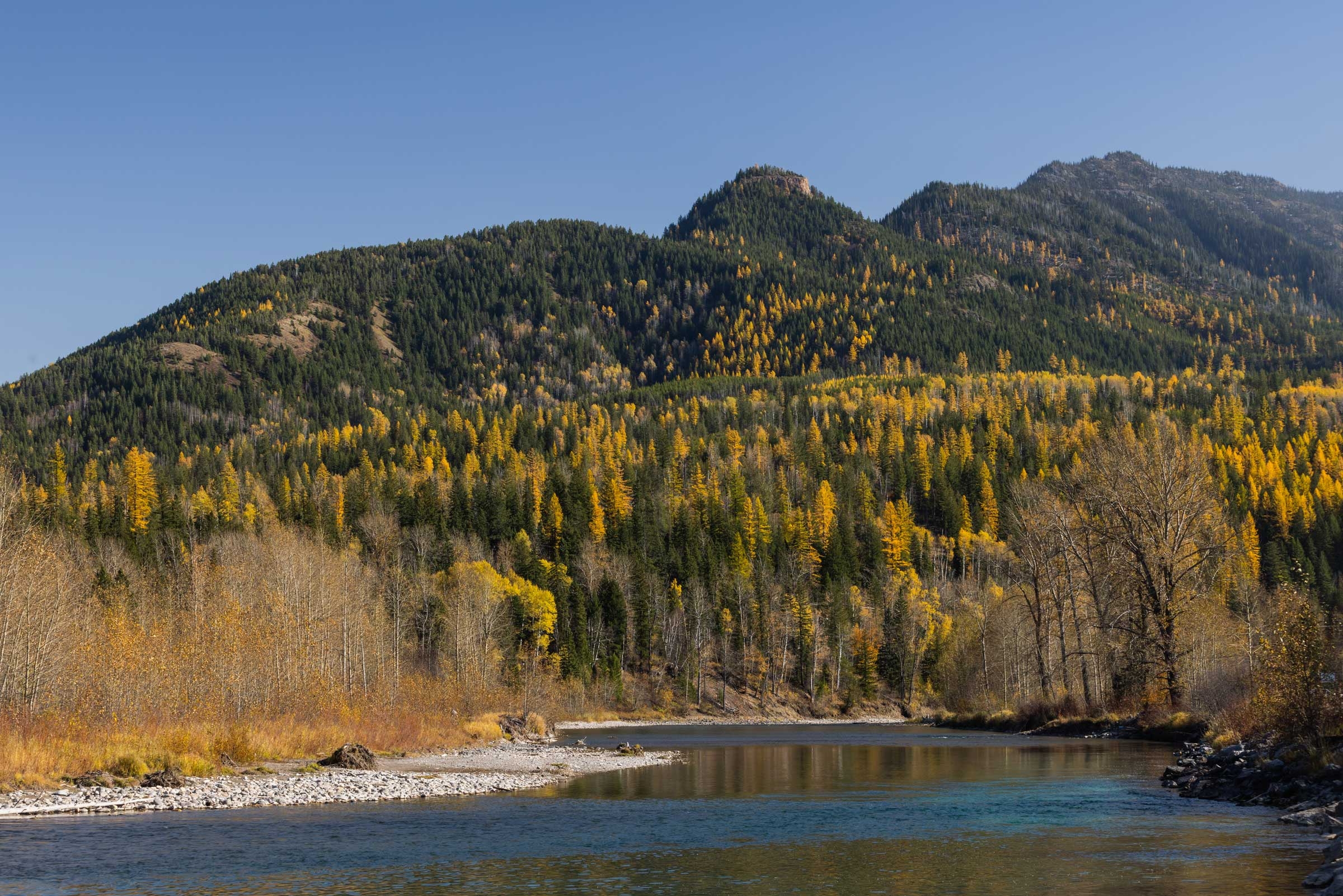 Take a leisurely walk along the Elk River for more opportunities to admire the stunning larches. The gentle sound of flowing water creates a serene atmosphere as you stroll, allowing you to fully immerse yourself in the breathtaking beauty of the surrounding landscape.